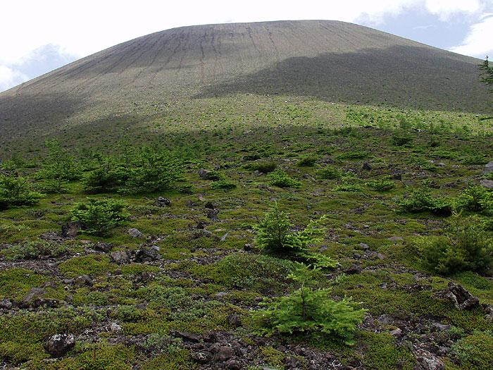 浅間山・湯の平(04-07-13歩く) 浅間山は登山規制がされているし、富士山を小さくしたような山で遠くから眺めるものと思っていたので、特に、 これまで登ることに興味はなかった。しかし、最近、湯の平付近の草原にアヤメが咲く と知って不思議に思い、急遽晴れ間をみて行ってみた。そして行ってみて驚いた。 外輪山の黒斑山の下の湯の平は火山岩の砂礫の地と思っていたが、青々と茂った森と草原があった。 いつものように4時頃に自宅を出発して、東名→環八→関越→上信越道を通って佐久ICで降りる。そこから141号線に出て右折し、どこまでもどこまでも真っ直ぐ行くと浅間サンラインというのにぶつかる。これを左折して すこし行くとトンネルが二つあり、二つ目のトンネルの手前で左に登り、車坂峠に通じるチェリーパークラインに乗る。このルートは 初めてであったが簡単で近いしいいルートであった。 すこし登ると浅間山荘方面への標識が出てきて、右の林道に入ってゆく。この林道は使いもしない林道をせっせと舗装している 世の中なのに珍しくダート道である。昔懐かしい道を土埃を立てながら進んでゆくと佐久ICから30分で浅間山荘に到着した。 そこには登山者用の無料駐車場があり、身支度して出発する。最初は渓流沿いの林道を行く。道はウツボグサが多い。二回ほど渡った 橋から渓流を見下ろすと、鉄分の多い温泉が流れてきているのだろうか、川底は今まで余り見たことのないさび色である。 林道はカラマツ林からコナラ林へと緩やかに登って行く。35分も歩くと道幅が狭くなり山道になる。そこから7,8分行くと渓流に降りて一の鳥居に着く。 ここは斜面をトラバースして行く道と渓流沿いの不動の滝径由の道との分岐となっている。 我々は不動の滝径由の道を選んでんでゆく。コナラ、ミズナラの美しい道で、カラマツソウが多くゆらゆらと揺れている。 シシウドの花、クルマユリ、クガイソウ、シモツケ、などが咲き、写真を写しながらしばらく行くと 不動の滝となる。落差30m位はあるだろうか秋の紅葉の頃はよさそうである。ここより5分ほど急登すると一の鳥居から分かれたトラバース道と合わさり、二の鳥居に着く。 ここで小休止する。 二の鳥居から、山道はカラマツの大木の多いところとなり勾配もきつくなってくるが、シモツケ、 クルマユリ、ユウスゲなどがところどころに咲き慰めてくれる。二の鳥居から20分も登ると右手の樹間から牙山が迫って見えてくる。 さらに行くと、左上には荒々しいトーミの頭の岩稜がガスに見え隠れする。まるで岩山の広い門をくぐって行くようである。 しかし、それとは対照的に、行く山道の周りは黒木の点在する明るく開放的な草原となり、オダマキ、フウロウ、シモツケソウ、ユウスゲ、 カワラナデシコ、シシウド、アザミなどが咲いている。そこにはカモシカ平という標識がたっていた。 さらに進むと左にはトーミの頭、黒斑山と連なる荒々しい大岩壁が迫り、右には牙山が牙の形から軍艦の船体のような 形になって周りを圧倒するようになる。右に深い沢を見下ろしながらさらに進むと、硫黄の匂いがしてくる。 沢は浅間山荘付近の渓流と同じ様に赤褐色の錆色を呈してくねりながら下っている。まもなく山道は沢の源流に達し、沢を渡って登り返すと 火山館に着く。 火山館は避難所である。トイレ、水道もある。火山情報も掲示されていて、この日、立ち入ることの出来るのは賽の河原までと あった。今日は湯の平までと思ってきたが賽の河原まで行くことで、小休止の後出発する。 火山館の裏をすこし登ると平坦となり、アヤメ、フウロウの咲くシラビソであろうか針葉樹の点在する草原に出る。 この辺が湯の平のようである。さらに行くと右手奥にほぼ円形状にアヤメが群生する明るい広場が見られ、小鳥もさえずり、 まるで桃源郷である。左手を見るとこの桃源郷を取り囲むように荒々しい外輪山の岩壁が連なっている。人間はこのように 囲まれると安心するのであろうか、本当に心の休まる場所であった。 花や周りの山々を眺めながら行くとわずかで看板の立つ湯の平口に着く。 ここからトーミの頭への登山道が分岐している。巧みに登山道は作られているらしいが、一見してこんなところを登れるだろうか と思うほど迫力ある岩峰と斜面である。トーミの頭への登山道を見送って真っ直ぐ行くとやがてシラビソであろうか針葉樹林の中に入ってゆく。 視界は樹木にさいぎられて、林床のマイズルソウやゴゼンタチバナを愛でながら進む。 20分も歩くと前掛山とJバンドの分岐点に着く。そこにはロープが張られ、立ち入り禁止とある。ここも樹林の中、視界が効かない。 ここまで来て、引き返すのでは折角山に来ても欲求不満がたまるだけである。HPで読んだが、ここからすこし進むと木々もなくなり浅間山 が見えるところがあるとあったので、自己責任で少し進んでみることにする。 5分ほど登ると木々はなくなりケル