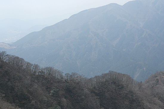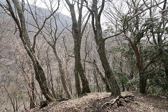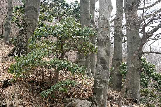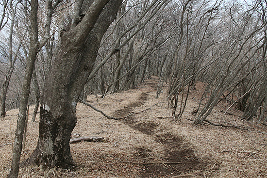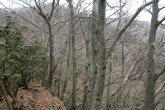 地獄沢橋〜地獄沢左岸尾根〜大山〜北尾根〜地獄沢橋('06-03-24歩く) マイカーで山歩きしていると、いつも気にして探しているのは周回コースである。近場の山で、山と高原地図とかのコースを見て、自分で 設定する歩きやすいコースには限りがある。後はバリエーションコースである。世の中、結構、殊勝な人がいるもので、 地図に無いコースを歩いている人がいる。これを探すのはインターネットである。たまたま、地獄沢橋からダイレクトに登った記録があった。 記録はあまり詳細でないし、地図も付いていない。しかし、1/25000地形図と照合してみると理解できた。地獄沢橋周辺はミツマタの花が 咲いているだろう、その撮影も兼ねて行ってみた。 先ずの関門は尾根への取付き点である。尾根は地獄沢の左岸側の尾根で、大山の山頂近くから 派生している途中に1021mのピークと送電線の鉄塔のある尾根である。 今回はこの取付き点を発見するのに手間取ってしまった。昭文社の山と高原地図「丹沢」 にあるように、地獄沢橋からミズヒ沢沿いに林道が上がっている。地図ではミズヒ沢で終わっているが、実際はさらに延長されていてミズヒ沢と地獄沢の間の 尾根を巻きながら地獄沢の方に伸びているのを、以前北尾根を歩いた時確認していた。その林道は地獄沢を突っ切り今回の尾根のあたりまで延びていると予想して ミツマタを写しながら林道を登っていった。そしてたどり着いたのは深い地獄沢を目の前にした林道終点であった。なんと、林道は地獄沢左岸尾根まで行っていなったのである。 見つからなかったら仕方がない、今日は大洞橋の上のケヤキの美林でも写しに行こうかと、思いながら取付き点を探しながら林道を下る。 地獄沢にかかる橋を渡って沢に沿って下り、左にカーブしたところにプラスチックのステップのある登り口があった。ここはこの尾根の 途中に立つ送電線鉄塔の巡視路入り口のようである。こんなにはっきりしている登り口、なんで最初見付からなかっただろう。思い込みというのは恐ろしい。 杉の植林地を登っていく。直ぐ、若い杉の植林地の金網のフエンスが現われる。道が荒れ、ところどころにプラスチックのステップが転がっている。 それを目印にフエンス沿いに登って行く。やがて、フエンスは左上に曲がる。ここもフエンス沿いに忠実に登って行くと、フエンスをまたぐオレンジ色の 梯子の立っているところに至る。ここでフエンスとは別れ、右上にプラシチックのステップを目印に尾根を登って行く。 後は尾根を外さないように上って行く。やがて道は勾配がゆるみ少し左へ巻き気味にゆく。そうするとこちらの方角を指している、巡視路 の白い看板が立っている。ここまで、登り口から約45分である。 ここを右にステップがところどころにある尾根を登って行く。 10分も登ると、杉の植林地帯を抜け、雰囲気のいい、自然林の広い尾根に到る。大木がところどころに立っている。ブナかな、と思って よく見るとケヤキとミズナラのようである。尾根に沿って左に緩やかにカーブし、今度は右に少しカーブしながら緩やかに上って行くと、 先に送電線鉄塔が見えてくる。 鉄塔までは何とか道の形跡があったが、この先どうだろう、と心配になる。というのは、見渡してみると、これから向う 方面は潅木で覆われ、道標も無いし、踏み跡もない。兎に角、正面の潅木の薄いところに入ってみた。そうすると、金網の古いフエンスが立ち、コナラの美林の尾根が 左上に続いている。直ぐ先で倒れている金網のフエンスを越えて、尾根に乗る。そして上がってゆく。尾根は右に緩やかに カーブしている。梢越しに、左側には16号鉄塔から地獄沢橋に至る尾根が見える。なかなかコナラの美しい尾根である。 振り返ると鉄塔がコナラの上に見える。迷ったら、鉄塔目指して下ればいいと、気楽な気持ちで写真を写しながら登って行く。 やがて、広くて潅木の疎林の少し見通しの悪いところとなる。ここは尾根を外さないように行く。 そしてまた、尾根が明瞭になり、コナラやミズナラの多い自然林を緩やかに上って行く。そうすると、鉄塔から約30分位して小ピークに達する。ここで小休止する。 この先は少し下っている。尾根は狭くなり明瞭である。登り返すあたりの左側にブナの大木が二本現われ、そしてブナの向こうに 北尾根が手に取るように見える。 好ましい自然林の尾根をさらに緩やかに登って行くと、アセビの木のあるピークに達する。 ここは地形図の1021mのようである。目の前には大山が迫り、足元から続く尾根は一旦左斜め前に下ったのち立ち上がり大山の山頂に向っている。 もうここまできたら行くしかない、と思う。ここからは「水源の森林 神奈川県」という頭の赤い白い角柱がところどころに立ち、道案内してくれる。 鞍部を過ぎると痩せ尾根の登りが続く。丹沢にしては珍しく元気な肌の白いブナが次から次へと現われる。時々緑のアセビが彩りを添