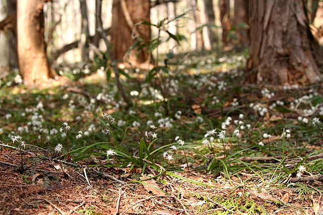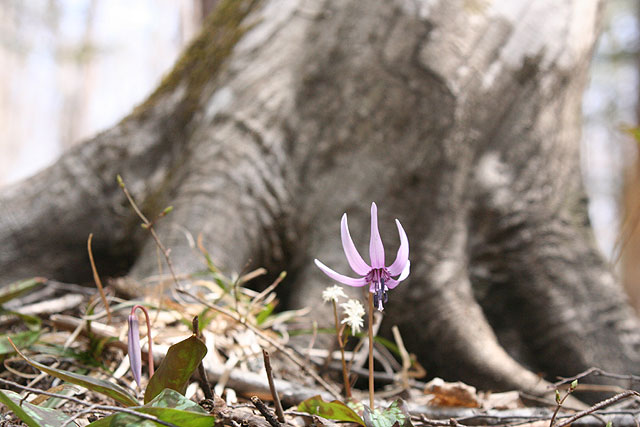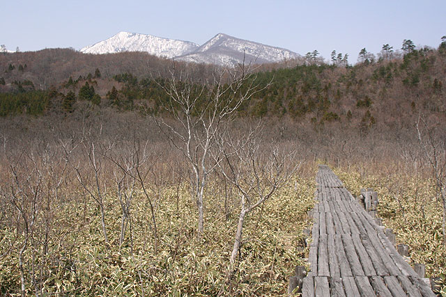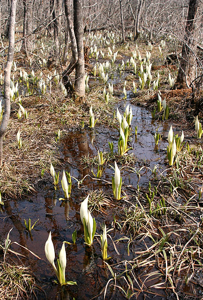 水芭蕉の森 ('05-04-19歩く) この時期、東北道を通って秋田の実家に帰るのが毎年の恒例になっている。今年は桜前線の歩みが遅くて、まだ仙台までしか北上していない。 秋田で桜を見るのはできそうもない。それでは途中、福島の花見山に寄ってみょうかと思ったが、混みそうである。 そこで、山の雑誌を調べて水芭蕉でも見てみようと、白石市の水芭蕉の森・どうたんの森に寄ってみることにした。 いつもは5時ごろ自宅を出るが、今回は4時出発とした。白石ICについたのは9:03であった。それから国立青少年野営場を目印に 国道457号線を行く。要所要所にこの時期だけの水芭蕉群生地方向を示す標識が立てられている。今、見ごろなんだ、と一安心する。 峠らしきところに登りきると広々とした牧場の向こうに白銀の蔵王の山並みが連なり、日本離れした雄大な風景が展開している。 標識に導かれて、国立青少年野営場方面と別れ、遠くに蔵王が望まれる森の道へと入ってゆく。やがて終点となり仮設トイレのある 広い駐車場につく。約白石ICより30分である。 廻ったコースは添付略図のとおりである。水芭蕉だけかと思ったら、カタクリ、コバイケイソウ、エンレイソウ、キクザキイチゲ、ショウジョウバカマ 、セリバオオレンが咲いていた。特に、水芭蕉とカタクリは広大な範囲に群生していた。かたくりは日だまりのところは 咲いていたが、まだ、時期尚早で、今年の花の見ごろは五月連休のようである。 ここで、特にすばらしいのはセリバオウレンの群生である。小さな花で目立たないが、杉林の林床にびっしりと広く群生していた。 ついでに、どうたんの森を廻ったが、閑散としていた。花は6月から7月にかけてのようである。 ●コースタイム 自宅3:55==東名厚木・首都高速・東北道浦和==東北道白石IC9:03==水芭蕉の森(P)9:30--セリバオウレン咲く林9:55--どうたんの森分岐10:14--どうたんの森一周--水芭蕉の 森中央木道入口10:48--水芭蕉の森(P)11:13 ●略図 水芭蕉の森マップ ●特記事項 首都圏から水芭蕉の森だけでは物足りません。今回、実は帰りに花見山によってみました。花見山と一緒にと言うのが いいかもしれない。下に簡単に紹介しておきます。 花見山 ('05-04-22歩く) 実家からの帰り、仙台に差し掛かると、いいお天気である、春の日を浴びて華やかに輝いて咲く桜が車窓を流れていく、福島に入ると桜 のほかに桃やスモモなども咲いている、まるで桃源郷である。とうとう、行くときはあきらめた花見山、渋滞していたら引き返すことで、 行ってみることにする。 福島飯坂ICで花見山に行きたいのだが、というと 交通規制のチラシをくれた。それを見ると一昨年行った時の花見山の近くの駐車場はバス専用で、乗用車用の駐車場は数キロ離れたところに二箇所 設けられており、そこからシャトルバスが出ているようである。その一つである親水公園の駐車場に向かう。比較的すいていてスムースに 河川敷の臨時駐車場に到着する。シャトルバスは20分毎にでていて、約10分ほどで花見山のバス専用駐車場に到着した。思ったより スムースに行けた。 現地に着くと以前より出店が増え、見物人も多い。花も桜が満開で、寒緋桜、レンギョウ、ハナモモ、ボケ、トサミズキ、 ユキヤナギ、こぶし、菜の花、・・・・、本当に春爛漫である。私は花見山の頂上には一度登っているので下で写真でも写していたいくらいで あったが、初めての連れにお付き合いして登ってみた。花見山のバス発着所から1.5hr位で花見山山頂までゆっくり往復できた。 なお、花見山の廻りを周回する2hrほどのハイキングコースもあります。詳しくはブルーガイド ハイカー「里山・低山ハイキング」実業之日本社発行に載っていますので参照ください。 ![]() 花見山の花吹雪 |