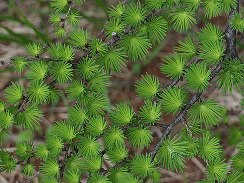 | 山道は整然と林立する美しいカラマツ林の中を登って行く。20分ほどジグザク登ると白樺と少し赤らんだつぼみ