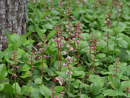 を付けたレンゲツツジが見えてきて唐松尾根に登りつく。 なお、昭文社の山と高原の地図にはこの尾根には右に行く細い山道もあって、八千穂高原池の平牧場付近に 尾根伝いに下ることができるように記載されているが、踏み跡は見つからなかった。どうも細い山道は消滅しているようである。 平坦な尾根を左に行くが、平坦はつ かの間で急登が続く。道端にはツバ メオモトやマイズルソウがかわいらしい花を付けており、疲れを癒してくれる。 |