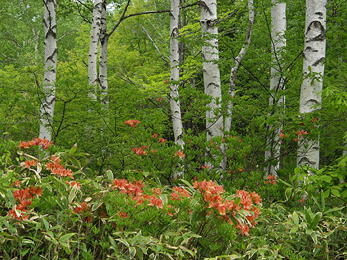 | 花木園の右側の林道が八柱山への入り口である。白樺の点在する花木園の敷地は燃えるような レンゲツツジで埋め尽くされている。林道は緩やかに上っている。両側はどこまでも白樺林である。 所々にレンゲツツジやズミの花が彩りを添えている。そのコントラストが実に美しい。 しばらく行くと林道は左に折れるが白樺の美しい風景は続く。気に入ったスポットで写真を写しながら 行く。人は誰もいない。静かである。カッコーや鶯の声が時々聞こえる。 |