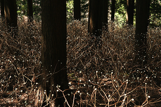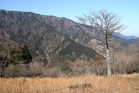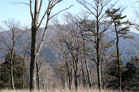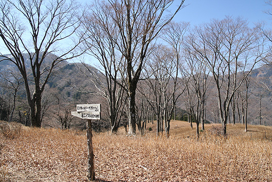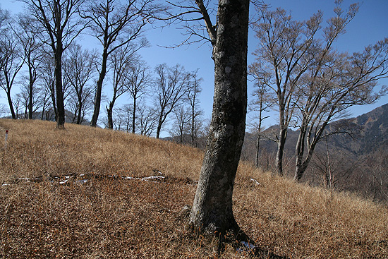 札掛からヨモギ平('06-03-15歩く) 昨年の4/15、諸戸からヨモギ平〜三ノ塔と歩いた。今回はヨモギ平のケヤキの木の写真をじっくり写そうと、まだ歩いていない 札掛〜ヨモギ平のコースで登り、諸戸のBOSCOオートキャンプ場に降り、県道を札掛に戻ることで計画した。 札掛の「札掛森の家」 の50m位手前の左側の駐車場に車を置いて、札掛森の家の横を通って吊橋の下の藤熊川とタライ小屋沢の合流点に下る。 ヨモギ平に行くには沢を渡って向かいの尾根に取り付かねばならない。しかし、吊橋付近は雪解けのせいか水量が多く、渡れそ うない。徒渉点を探してタライ小屋沢の上流の方に向う。丹沢ホームの下あたりでようやく徒渉点を見つけて渡り、対岸を吊橋の方に戻 る。 さて、どこから尾根に取り付くのかと探すと、「保安林」という黄色い立札の傍に踏み跡がある。それに沿って上がる。 そのうち裏側に回り込んで行ってしまうようであるので、立ち止まって確認する。右上を見ると上に登る踏み跡がある。それに取り付き、尾根に乗る。そこからは明瞭な 尾根道である。 結構、背の高い太い杉並木の尾根道である。杉林というと陰鬱な感じを受けるが明るく気分が滅入ることは 無い。その代り、風通しが良く、冷たい風で手がかじかんで来て手袋をして登る。この尾根は地形図で見るとおり、等高線が込み合っては 広がる、というパターンの繰り返しである。ということは勾配がきつくなって疲れた頃、フラットになる、ということで極めて登りやすい 道である。そして途中から赤テープが道案内してくれる。 何回か登りとフラットを繰りかえして30分ほど登ると、少し痩せた尾根になり、 目の前に露出した木の根の張り出したステップが立ちはだかる。迂回の道はないのかと左右みて赤テープを探すが無い。 これは根っこを乗り越えることだと解釈し、乗り越えると傾斜もゆるみ、赤テープの巻き付けられた3本の柱の立つピークに達する。 ここから少し下って再度登りにかかる。相変らず杉並木の尾根道である。12,3分も登ると初めて明るくなりミズナラの大木の立つところとなる。 しかし、すぐまた杉並木の尾根道となり、5分ほど登ると自然林のピークに達し、赤テープが2本ほどぶら下がっている。 ここより根っこの露出した少し痩せた尾根を登って行くと前方が開けて雪と枯れ草で覆われた台地が上に見えてくる。 平坦な台地に立つと右側の冬木立の向こうに長尾尾根が長く横たわり、ヨモギ平に似た雰囲気である。そろそろヨモギ平と思う。 雪の草地にはテンニンソウのドライフラワーが一面広がっている。そして一筋の道がずっと先の桧の疎林の中に消えて行っている。 これは桧だろうか、まるでクリスマスツリーを飾るもみの木のように三角の樹形である。 桧の疎林を抜けるとヨモギ平か、と軽やかな気分で歩いていたところ、また杉林に入る。がっかりである。少し行くと登りとなり、二又に分かれている。正面の道は荒れている。左のピークを迂回するような道の方がいい道で迂回するなら 楽でいい、と左に行く。しかし、巻くもののいつまでたっても上に上がらず下り気味である。これは間違いと思って引き返す。 分岐点に行ってよ〜く見たら真っ直ぐ行く方に赤テープがある。最初は木に隠れて赤テープが見えなかったようである。ここは要注意 である。 薄暗い杉林だし、道は間違うし、滅入って登っていったところ、思いがけず右手にブナの巨木に近い大木が現われる。 杉林のため南側からの日は当たらないと思われるが、良くぞ生き永らえてきたものだと感心する。ブナに元気をもらってさらに上って行くと金網の柵が見えてきて、その向こうには あの見覚えのあるテンニンソウのドライフラワーで一面覆われた明るい草地にケヤキの大木の立つ美しい風景が展開している。 写真を写し写しのんびりと上って行くとピークに達し、そして、その直ぐ下に見えるベンチがありヨモギ平の道標の立つ諸戸と三ノ塔の分岐点に下ってゆく。 ここにザックを置いて右斜め下に展開する美しいケヤキの台地を写真を写しながら散策することにする。 左手には大山、正面には三ノ塔、右手には長尾尾根・・と、ヨモギ平をとり囲むように横たわっている。その広々と周囲の山に囲まれたヨモギ平の 空には久しぶりに澄み切った青空が広がり、その左上からやわらかい春の日差しが注ぎこんできている。そして、なだらかな台地一面に広がるテンニンソウのベージュ色のドライフラワーは 温かい空気を漂わせ、 空に広がるケヤキの梢は輝き、野鳥たちは囀っている。 一廻りした後、ベンチに戻り昼食とした。 そして、諸戸へブナの木を見上げたり、大山を眺めたりしながらのんびりと下った。県道に出てからは札掛まで約50分である。車道歩きは退屈なので、途中、地獄沢橋でミツマタの群生地に 寄って写真を写して気分転換し、残りの札掛までを歩いて、この山歩きを無事終えた。なお、ミツマタは