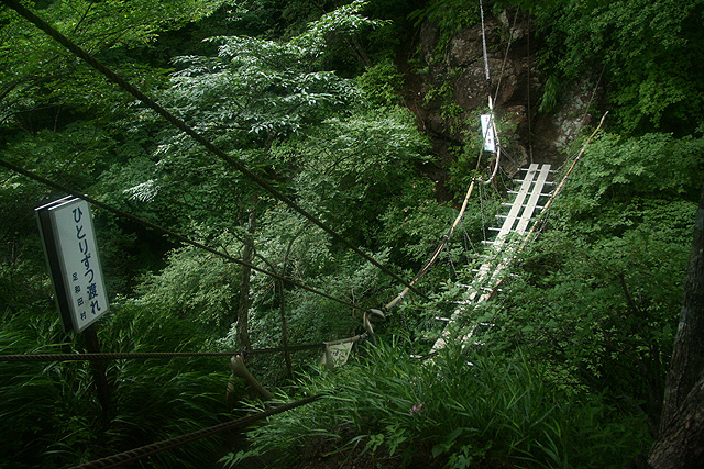 岩場を下ると、下に吊橋が見えてくる。吊橋はアルミ製のしっかりしたもので危険はない。両側の吊っているメインロープにつかまりながら渡る。