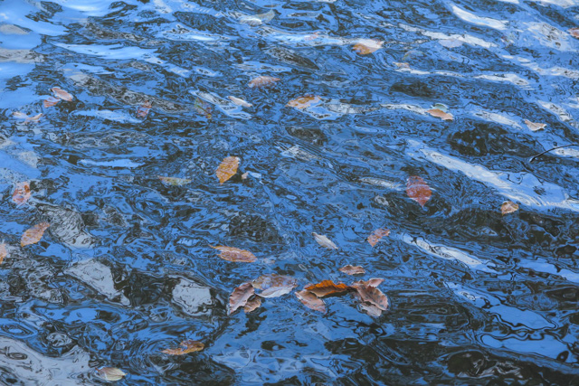 水鳥の波紋に揺らぐ落ち葉、空を写し込む水面模様等、を写しながら行く。やがて大木と与謝野晶子の歌碑の立つ広場にいたるとモミジやナンキンハゼの紅葉が綺麗である。
