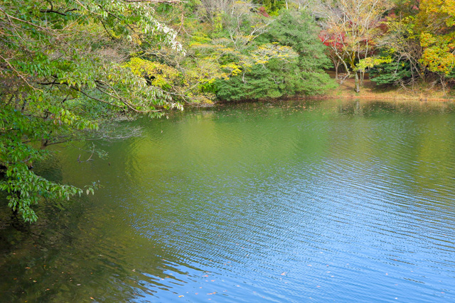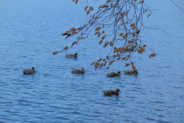 水鳥が泳ぎ、落ち葉が湖面に漂い、木々の影が水面に揺らいでいる。向かいの森も大分色付いてきているようだ。