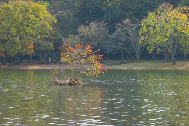 最西端の鳥居と祠のあるチョとした半島では入り江の映りこみなどを写す。さらに廻りこむと、今回、期待してきたもみじ広場に着く。