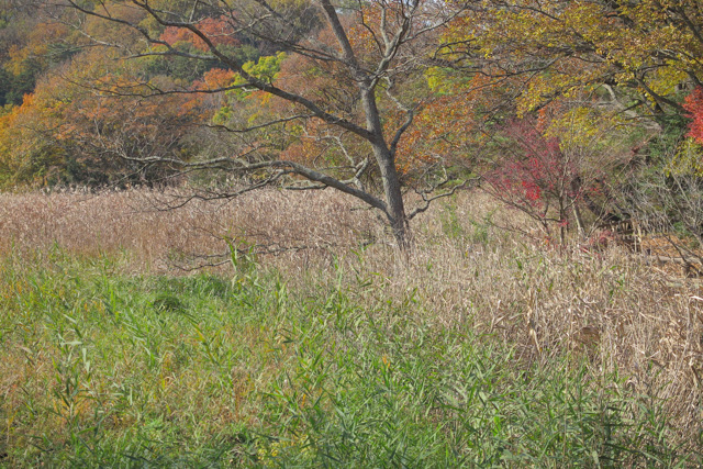 橋を渡り、南湖畔を廻りこんでゆく。右手に紅葉の疎林とススキの原を見ながら行くと、常緑樹の森に入ってアップダウンを繰り返しながら行く。ここも見晴らしが効かず、くびれ近くに来て