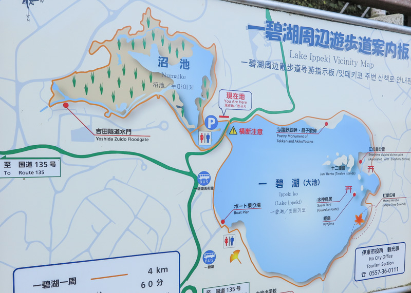 ここからは湖畔沿いの遊歩道を行く。鯉や水鳥と遊びながら行くと、間もなく湖の駐車場のくびれたところに至る。丁度昼時、瓢箪の頭部分の沼池の北側、すなわちホテル近くの東屋で昼食とする。
