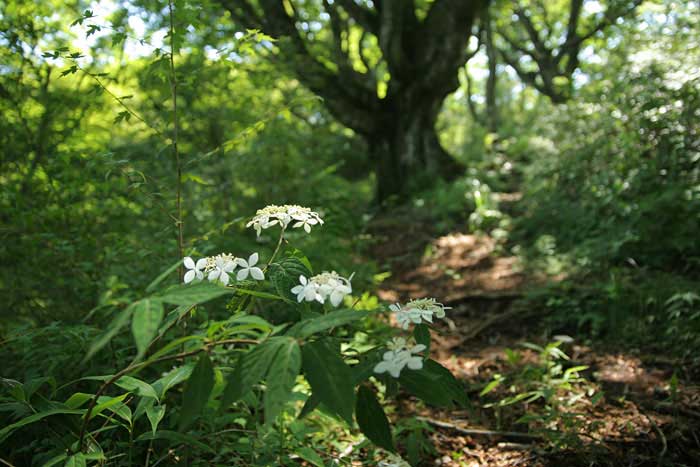 すると三国山の主のブナの巨木と出会う。すらりとした東北のブナと違って、箒のように根元近くから枝を延ばしている武骨なブナである。周りには山アジサイやツチアケビを従えている。