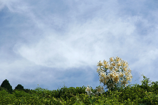 それから奥に上がってゆくと、ねむの花が咲き、そのピンクが青空に映えて爽やかである。さらにさつき山の斜面には大株のたわわに花を付けたヤマユリが点在し、