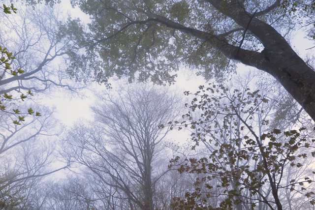 幻想のブナ林を写しながら楢木山の方にゆく。そのうち晴れてきたので、「三国山稜--ブナの巨木を訪ねて--」の1250mポイント下の巨大ブナを探してみることにした。