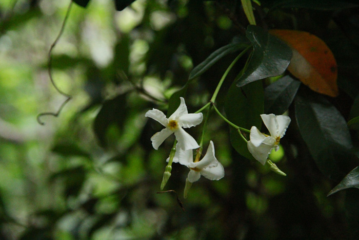 足元には無数の白い小さな落花が見られ、周りを見渡すと、木に絡みついたテイカカズラが
