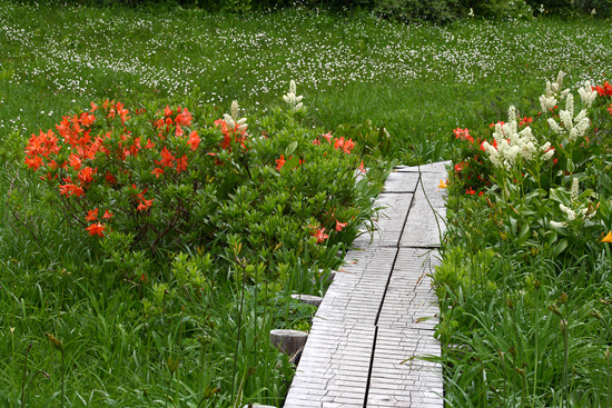 上って行くと、左側に湿原が広がり、赤、黄色、白、緑のカラフルな風景が広がる。ここは大場谷地というところで、この時期レンゲツツジ、ニッコウキスゲ、ワタスゲ、コバイケソウの花が