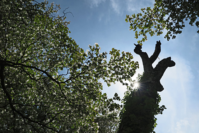 更に上がると、立ち枯れたブナの巨木の立つところに至る。その周りにシロヤシオが咲き、青空に花の白が透けて美しい。