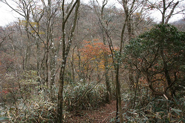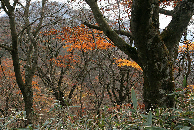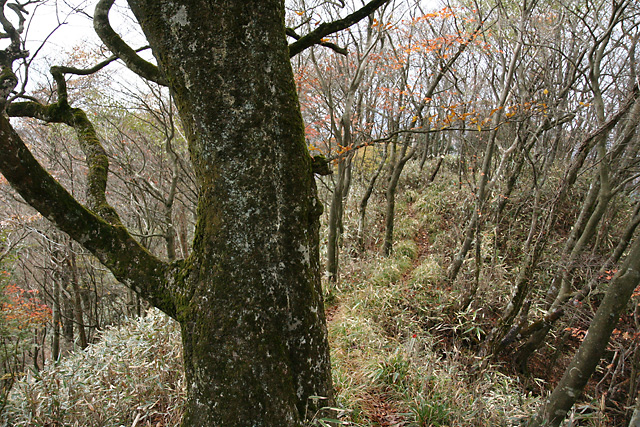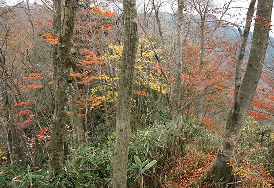 ![]() 大界木山付近の尾根道 ![]() 大界木山先のブナ林と紅葉 ![]() モロクボ沢の頭を望む ![]() ![]() モロクボ沢の頭と1200mピーク間の紅葉 ![]() 1200mピークとバン木の頭間の紅葉 ![]() 栂の巨木と紅葉 |