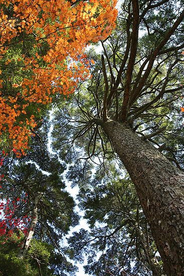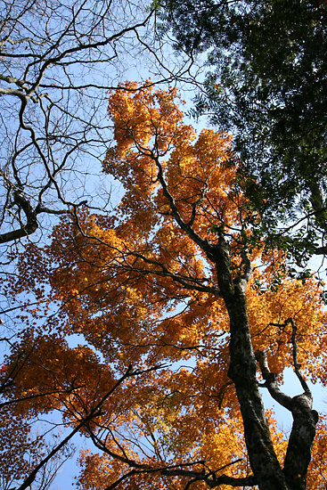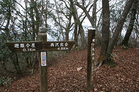 | 道志横浜市野外活動センター基点に大界木山・畦ケ丸を歩く ('07-11-17) 紅葉は、もう丹沢の山の稜線付近は終わり、麓に下りてきているであろう。紅葉の丹沢としては 今シーズン最後になりそうな山行、どこへ行こうかと思案する。その時、雑誌新ハイ12月号の記事「大界木山・畦ケ丸」が目にとまった。 12月向けのガイドであるが、今年は紅葉が遅れているので、昨年菰釣山('06/11/03)に登った時と同じような状態の紅葉が見られるかもしれないと行って見ることにする。 車を置く道志の横浜市野外活動センターへ、途中にある「道志の湯」を目印に道志道を行く。道志村役場の先に「道志の湯」の看板があり、それにしたがって左折する。 しばらく行くと右側の川原がモミジのきれいな園地のようなところとなる。そこの左側が「道志の湯」であった。 この道の主要施設は「道志の湯」位である。 そろそろ舗装が切れるかもしれないと思いながら行く。そうすると「的様」という名所があり、説明板が立っている。その先でいよいよダートとなる。 約2km位のダート道である。横浜市野外活動センターがあるから乗用車でも通れないはずがないと、少し荒れたところも強気で進んでゆく。15分 ほどダート道を行くと、横浜市野外活動センターに到着する。入口はチェーンで封鎖されているが、その前の左脇に2,3台分の駐車スペースがある。 身支度して右の林道を行く。左下が 横浜市野外活動センターのキヤンプ場になっていて、モミジやコナラ、ミズナラなどの紅葉がきれいである。林道の周りの紅葉や落ち葉を写しながら40分位 歩くとゲートとなる。その先2分も緩やかに登ると林道右側に古い「大界木山 登り口30分」という道標が立っている。 その反対側、すなわち林道左側に登り口がある。そこには道標はないが、はっきりした山道が左斜めに上がっている。東海自然歩道の稜線までの道は昭文社の地図「丹沢」では破線になっている。 最初少しザレているがすぐいい道となりジグザクと上って行く。7分も登ると尾根にで、ここから東海自然歩道の稜線へと登って行く。 紅葉の雑木林を少し行くと左側が大きく開け、足元から展開する紅葉の海原の向う、正面には道志の山、右に丹沢の山、さらに右上にこれから登る大界木山であろうかピークが望まれる。 道志道も、今、歩いて来た林道も両側が山に囲まれ、ずっと閉塞された感じであったからだろうか、一気に開放され、爽快な気分になる。 ここから、カサコソと落ち葉を踏み、明るく輝く黄色や赤のモミジを愛でながら左上に見えるピーク目指して尾根道を緩やかに上がってゆく。なかなかいい雰囲気で(上の写真)、秋山を歩ける喜びを感じる 。 やがて山道に熊笹が覆いかぶさって来ると、ひよっこりと東海道自然歩道に飛び出す。そこには道標は無く、立ち木にテープがあるだけである。 逆コースは入口が笹に覆われているし、道標もないので分かりにくそうである。 大界木山に向って左に上って行く。もう葉っぱが散ったのが多いが、ブナの巨木が尾根の両側に 結構立っている。ブナ好きな私にとっては予想外の道、撮影を楽しみながら上って行く。ピークに達し、大界木山と思ったら、右に折れた少し先のピークの外れの方に大界木山の標識があった。 ここで小休止した後、ブナの大木の立つ笹の山道を下ってゆく。正面遠くに畦が丸であろうか蒼いピークが見える。傾斜が緩むと ブナ林となり、所々にモミジが点在し彩りを添えている。そして、鞍部にたって振り返ってみると、日の当たった大界木山の斜面は紅葉が輝き美しい。 また、登りとなる。登りつくと左側が杉林の道となり、左方向に向きを変え、畦が丸らしきピークと遠ざかりながらさらに笹の雑木林を下ってゆく。そして鞍部らしきところの立ち木にテープ があり、その根元に小さい黄色い野活センターの標識「大界木←→畦ケ丸」があった。ここが忘路峠らしい。「わすれじとうげ」と読むのだろうか、寂しいロマンチックな名前である。 ここから小さなピークを三つほど越えると、前面に笹の下草にブナの大木が点在する大きな斜面が立ちはだかる。アオキのような小さい赤い実を付けたミヤマシキミが多い急斜面を10分弱登ると モロクボ沢の頭であった。ここから畦ケ丸を往復することにする。ブナの大木の立つ尾根を一旦下り、鞍部の小さな鎖場を越えて、緩やかにブナの大木に紅葉の混じる尾根を登って行く。道端に直径1m位の 花崗岩の円形の石が出てくると、すぐ目の前が避難小屋であった。 登って来る途中、声がしたが、避難小屋には誰もいなかった。 テーブルに荷物を置いて往復することにする。畦ケ丸まで新ハイ記事には3分とあったが、左手に見えるピークは手ごわそうに見える。 歩いてみるとそれほどでもなく3分ほどで畦ケ丸についた。山頂には大滝橋の方から登ってきたらしい4,5人のパーティが休んでいた。 見晴らしも効かないし、証拠写真を写してすぐ引き返す。