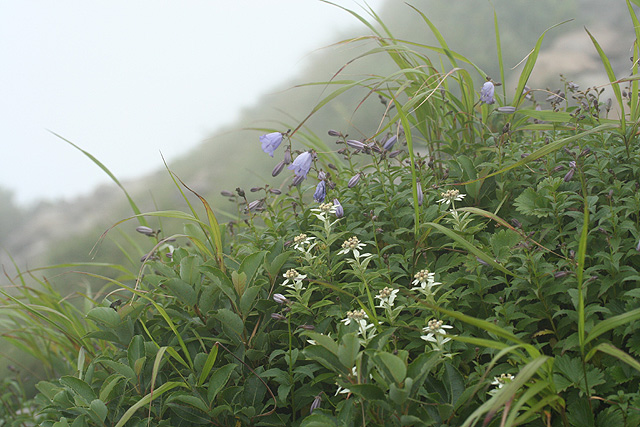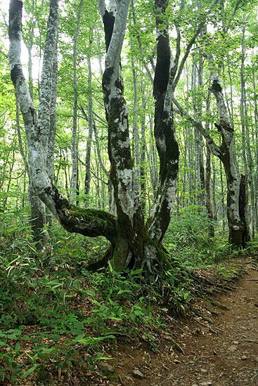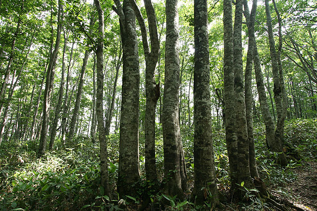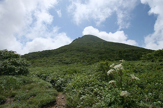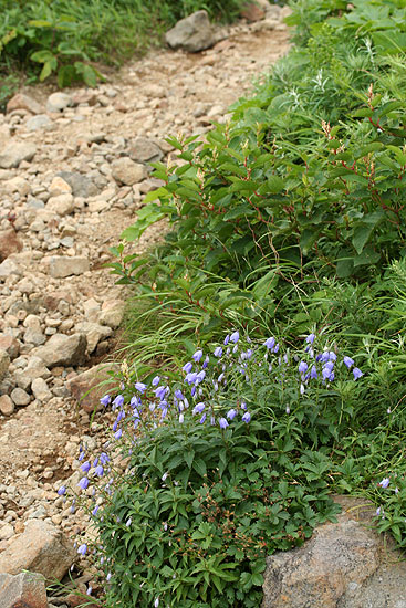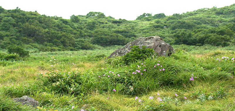 磐 梯 山 〜 八方台から磐梯山 〜 ![]() お花畑から磐梯山を望む 八方台から磐梯山-1818.6m-('05-08-02歩く) 首都圏から福島あたりの山にマイカーを利用してで登る場合、朝立ちして登山口につくのは早くても9時頃、普通だと昼近くになってしまう。 それから登るとなると、帰るのは無理であり、それにコースは半日コースがいい所である。そして、翌日も、現地に宿泊して即帰るのはもったいない、 では、半日くらいどこか登ってみょうかということになる。こんなことを考慮して、今回、二日間行程で組み合わせて登った山が磐梯山と一切経山である。 地図を調べて、時間的に最短コースである八方台から登ってみることにした。自宅から東名厚木IC、首都高速、東北道、磐越磐梯河東ICをへて5時間強かかって、ようやく標高1194m の八方台の駐車場に着いたのは9:12であった。八方台は草津白根ハイウエーのように開けた火山の瓦礫の駐車場と思ったら 樹林帯を切り開いた峠であった。 身支度して東側の登山口から樹林帯に入っていく。樹林帯に入ったとたんすばらしいブナの林立である。 磐梯山は宝の山だけあるなぁ〜と思い、写真を写しながら広い遊歩道のような山道を緩やかに登って行く。このブナ林の道が約30分弱続き、 温泉の硫黄の匂いがすると思ったら開け、山道の周囲から火山性ガスと温泉の滲み出ている中の湯という山間の温泉にでる。 その付近は湿地で木道となっていて、ノリウツギの花の群落がきれいなところであった。 この後、ダケカンバ、ブナ、ミズナラなどの混じる あまり見通しの良くない樹林帯の急登となる。そのうち、左が開けて、谷を隔てて火山性の荒々しい瓦礫の尾根が見える。さらに登り 高度が上がると、柵のある展望台となり、荒々しい先ほどの尾根の向こうに桧原湖、銅沼が見える。 ここを過ぎるとピークの右を巻きながら、一旦下り さらに上り返すトラバース道を行く。このトラバース道は結構長い。右に樹間より磐梯山らしきピークが見えてくると、間もなくお花畑・弘法清水分岐に達する。 お花畑は帰りに廻るとして、右の潅木の道に入る。山道は磐梯山の左を巻くように緩やかに登って行き、やがて小屋のある弘法清水につく。水を補給して 最後の30分程の石のごろごろした道を急登する。 高度が上がるにしたがってウスユキソウ、ミヤマシャジンが多くなる。眼下が開けたところも あるが、残念ながらガスって見通しは効かない。山道の浮石が多くなるとやがて石の多い山頂に達する。ガスって周囲は見えず、白い円筒状のスクリーンに囲まれたようである。 そしてそのスクリーンにはおびただしい数のアキアカネがシルエット状になって飛び交っている。 丁度、12:00である。近くの草花やアキアカネを眺め、ガスが切れるのを期待しながら昼食とする。昼食が済んでもガスは切れないので、周りの高山植物の写真を写しながら下山することにする。 弘法清水に着いて、右に少し行くともう一軒の小屋がある。そこから左にガレ場をお花畑目指して下っていく。前方には 磐梯山の双耳峰の一つである火山の荒々しい櫛ケ峰が望まれ、足元にはシモツケソウ、シシウド、ミヤマシャジン、オンダテ、ウスユキソウなどが咲いている。 やがて左へのフラット道となり、 お花畑への立ち入り禁止のために道の両側に丸太が敷かれている。ここのお花畑には今まで見たことのないようなミヤマナデシコの大きな群生がところどころに見られる。 これがこのお花畑の特徴のようである。磐梯山のピークをお花畑の裾野の原がぐるっと取り囲んで、なかなかいい風景である。反対方向には天狗岩が立ち、お花畑の風景を締めている。 花を愛でながら回り込んで行くとやがてお花畑・弘法清水分岐に着く。あとは元来た道をひたすら下って行く。 この日は郡山市の磐梯熱海に宿泊した。翌日は母成グリーンラインと磐梯吾妻スカイラインを通って浄土平に上がり、浄土平の駐車場に車を置いて、一切経山と鎌池を廻った。 (コースタイム) 自宅4:05==東北道・浦和IC5:32==上河内SA6:32〜7:02==磐越道・磐梯河東IC7:23==八方台(P)9:12〜25−中の湯9:52−銅沼の見える展望台 10:21〜25−お花畑・弘法清水分岐11:05−弘法清水11:17〜22−磐梯山山頂11:56〜12:38−弘法清水13:06−お花畑天狗岩付近13:24−弘法清水・お花畑 分岐13:35−銅沼の見える展望台14:10〜18−中の湯14:45−八方台(P)15:10 (地図) ・昭文社 山と高原地図 「磐梯・吾妻 安達太良 2005年版」 ![]() 八方台ブナ林 ![]() 八方台ブナ林 ![]() お花畑のミヤマシャジン ![]() 山頂のガスに煙るミヤマシャジン、ウスユキソウ ![]() ミヤマナデシコ咲くお花畑 < なお、写真はCanon EOS kiss DN / EF-S10-22mm/EF-S60mmマクロで撮影しました > |