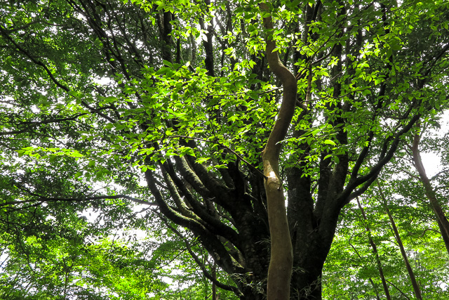 ブナとヒメシャラの混交林、ヒメシャラの純林、アカガシとヒメシャラの混交林という風に降りるにしたがって景色は変わってゆく。最初のブナとヒメシャラの混交林にはわずかであるがコアジサイとヤマボウシが咲いていた。