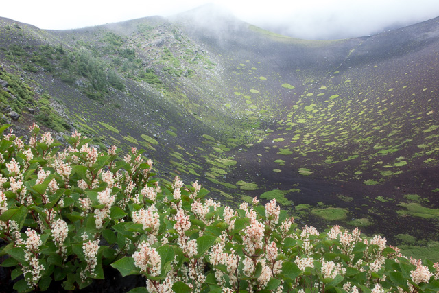 時にはガスった斜面にホタルブクロがぼっんと健気に咲く。火口底の方を見るとカラマツの幼木が育ちだし、霧に見え隠れする。
