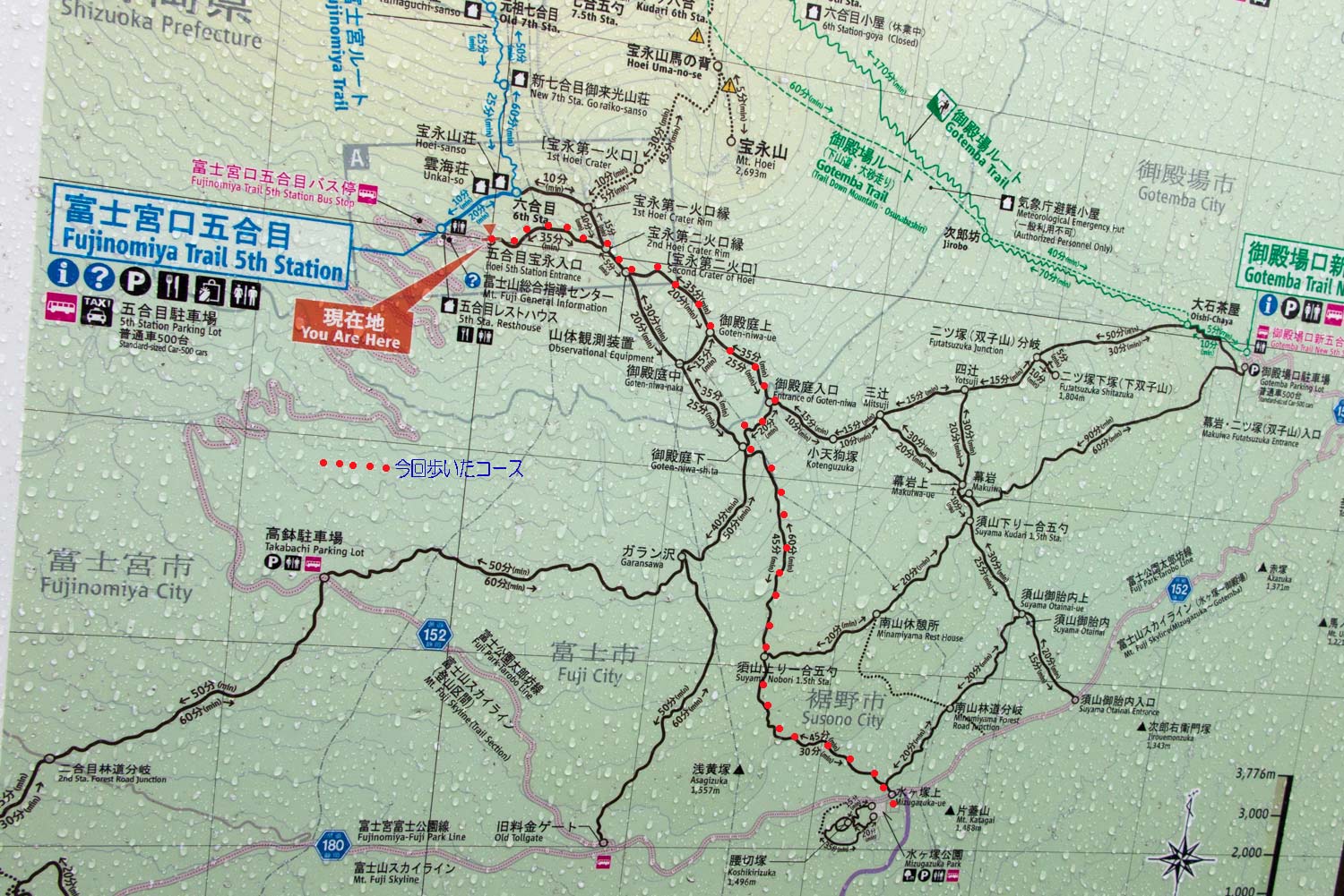 富士宮口五合目駐車場東端9:10---第二火口縁9:48---第三火口分岐(mapの山体観測装置)9:55---御殿庭上10:45---御殿庭入口11:21---