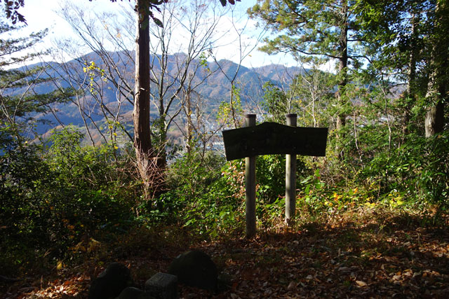 この鞍部あたりから杉林がまばらで明るくなり、林床にはアオキが見られるようになる。しばらく行くとまた道標が現れ、左隠川、右志田・三増合戦碑