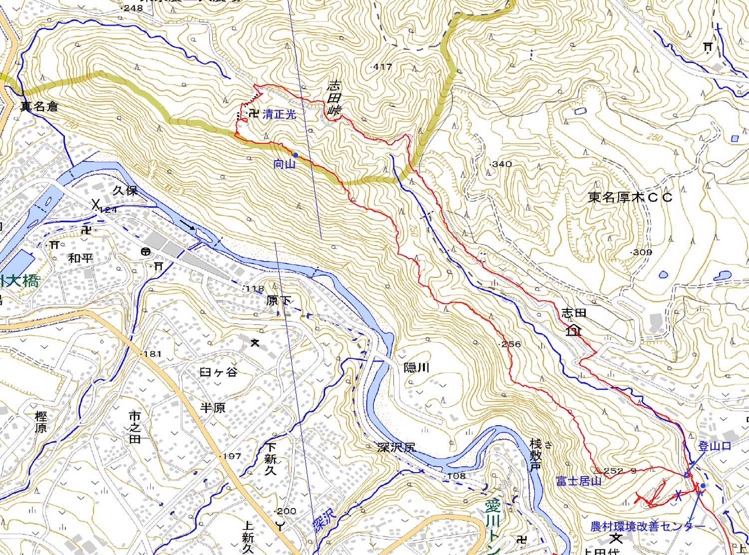 初めての山で、整備されていない山は登山口を見つけるのに苦労する。地形図を見て、愛川農村環境改善センターの前のUターンしながら登っている