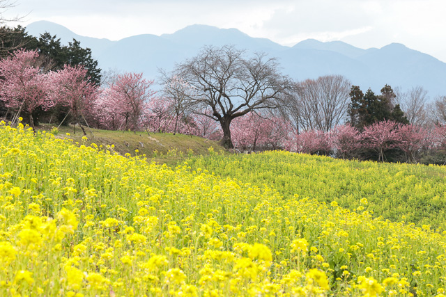 この斜面は、ふるさと農園四季の里「農業法人(株)蜂花苑」が管理する広大な菜の花畑であり、周囲にはソメイヨシノより少し早く咲く