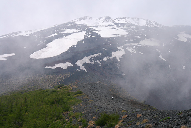 残雪の富士山がくっきりと見え、時々ガスが流れてくる。赤岩の下の月表面のような火口壁、オンダテなどの芽吹きはまだなく荒涼とした火口、