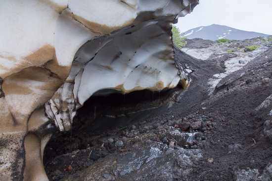 雪渓が溶けてたゆまなく水滴が落ちているが、滝の流れを作るところまでには至らず、滝は幻と化していた。