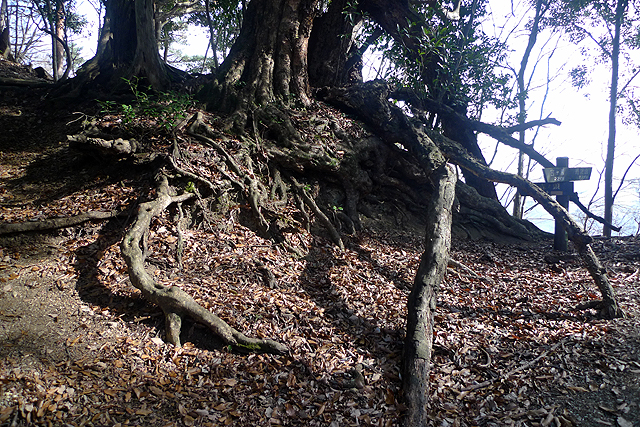 やがて椿とモミの大木の多い痩せた尾根を行く。しばらく登るとピークが見えてくる。直登するのかなと思ったところピークの左斜面に路肩に丸太を敷設した巻き道が現れる。突然の山道の出現を受け入れて巻いていくと、宮ケ瀬湖から
