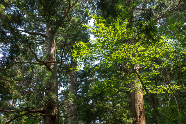 今回は更に県指定文化財の樹齢500年の杉林を撮影に、明神岳登山道を途中まで登り、杉の巨木の林立の中に輝く緑モミジを写したりした(map-B)。