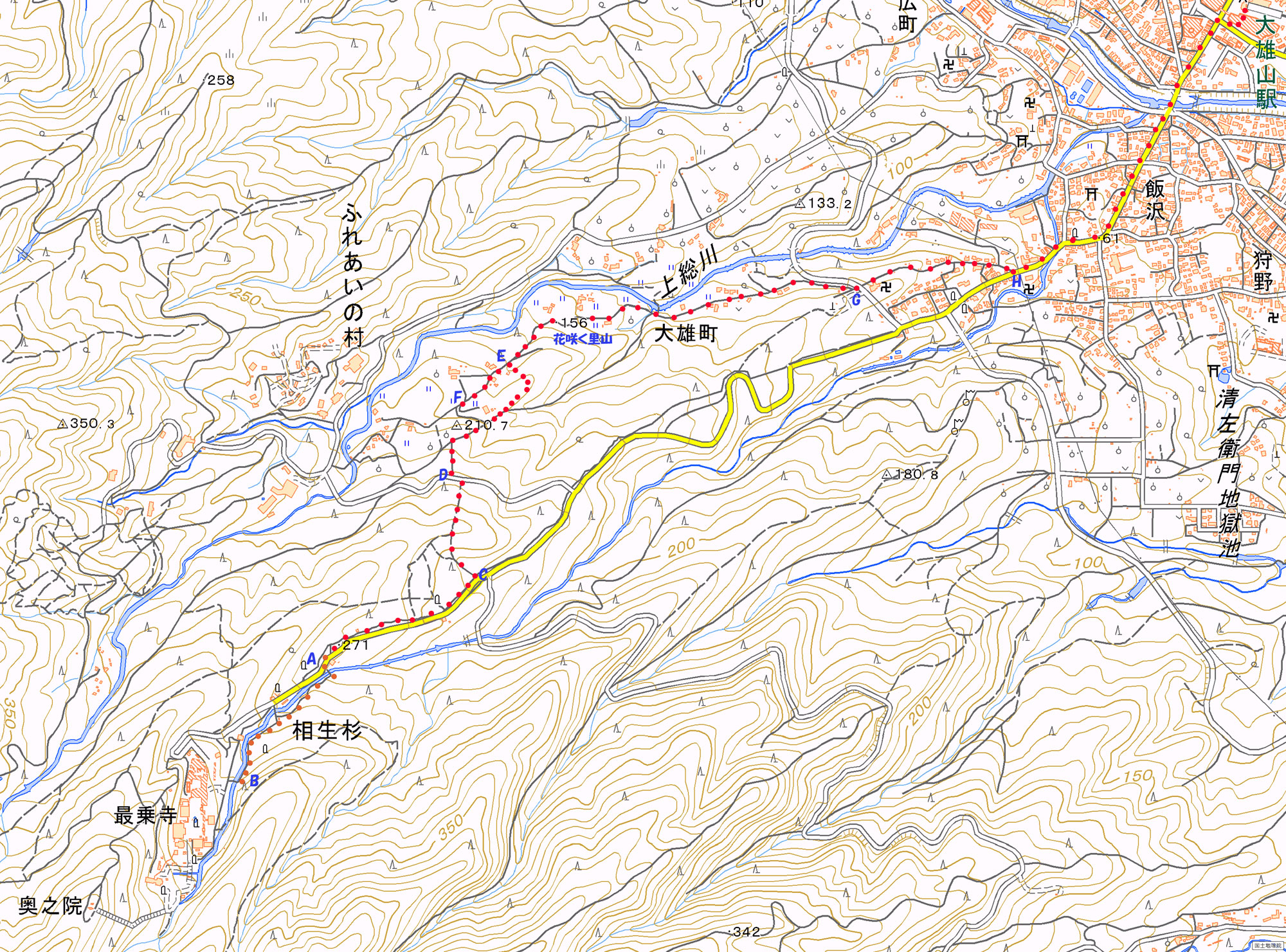 ---花咲く里山入口(map-G)12:55---Y字路(map-H)13:06---大雄山駅13:20