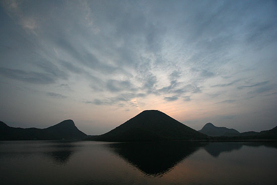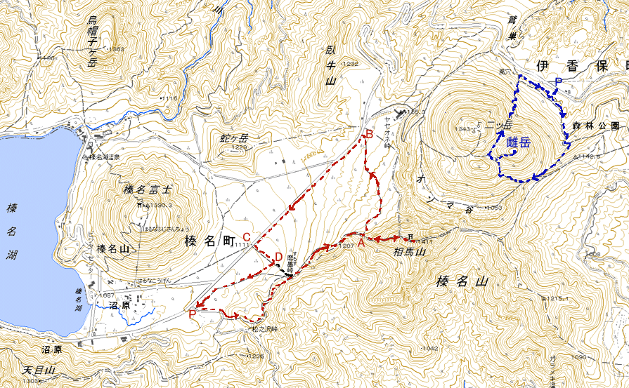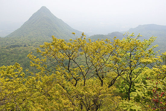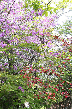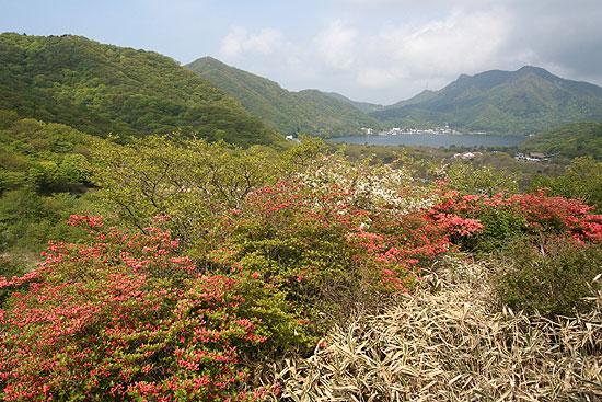 GWに孫が来て、ずっとそのお相手で、山歩きと写真撮影はお預けであった。山の新緑や花がどんどんと遠ざかってゆく。 山にも行きたい、孫とも共に過ごしたい。複雑な気持ちで過ごす日々。ようやく、5/25、孫はびっくりするくらい多くの言葉と動作の発育 記録を残して去っていった。そして、その翌日、新緑や花を求めて榛名山に登った。 相馬山('05-05-26歩く) 関越はいつも東名、環八、練馬ICのコースであるが、練馬の手前のトンネル工事で環八は大渋滞しているという話を聞いて、今回は 厚木、橋本、八王子を経て圏央道あきる野ICから関越に入った。榛名湖へは前橋ICと渋川伊香保ICから上がれるが、 ヤマツツジの開花がどこら辺まで登っていっているかを確認するために、渋川伊香保ICで降りる。 伊香保温泉の町並みを過ぎると車道の両側のヤマツツジが多くなる。上がるにしたがって満開のヤマツツジの燃えるよ うな朱色で道の両側が染まってくる。それが延々と続き、そのうちツツジ会場の横を通過する。榛名山のヤマツツジが早かったらここで ツツジ見物でもすればいいと思いながら登って行く。やがてツツジは少なくなってくるが、時々現われるツツジは、上に上がっても結構咲いている。 この分なら、全然ダメということはなさそうだと安心する。 やがて榛名道のヤセオネ峠に達する。相馬山に登った後はここに戻ってくる ことになっている。今日の駐車場は松の沢峠入口のグランドの駐車場ということにしているので、北海道の道路のような一直線の 車道を榛名湖目指して下ってゆく。両側のヤマツツジ、右側は色が濃いが、左側の疎林の織り成す草原のツツジはいまいちさえない。 グランドを探していくが見過ごしてしまい、湖畔まで行ってUターンする。ようやくユウスゲの道入口の辺りのテニスコート脇の駐車場に車を 止める。一台も駐車していない、静かな山歩きが期待できそうである。 萌黄色の混じる新緑初期の山のみどりがまぶしい。車道を山の 方に登って行くと、左側にヤセオネ峠方面の道標が立っている。そこを左に登る。いきなり木製の階段であるが、程よい段差で登りやすい。 両脇の木々、林床の野草は今葉っぱを開いたばかりのものが多い。ヤマツツジの花はどうか心配になる。ところがどういうことであろうか 現われるヤマツツジは結構咲いている。6〜8分咲きのもある。下の草原のツツジがさびしかったのでどうかと案じていたが、ホッとする。 次から次へと朱色の濃いヤマツツジが歓迎してくれる。思わず口元がほころびる。10分も登ると尾根に乗る。そこにはコナシまでも 咲いている。後ろを振り返るとヤマツツジとコナシの向こうに榛名湖が見える。ここからはアップダウンの少ないヤマツツジの道を のんびりと行く。ヤマツツジはレンゲツツジより日陰にも耐えるようで、みどり一色の樹間に点在し、ひときわ朱色に輝く姿はなかなか いい風景である。10分も歩くとまた木製の階段を登り、さらに平坦なヤマツツジ咲く尾根道を7,8分行くと、スルス岩に達する。道は左を 巻いてゆく。今日の主目的は相馬山であるのでパスする。頭上のスルス岩の周りにはミツバツツジが咲き、逆光に輝く紫系のピンクが美しい。 岩をまき終わると左に草原に下る道が分岐している。ここがスルス峠のようである。 ここより開けた緩やかに 登るヤマツツジの咲く尾根道となる。ここまで誰一人として会わない静かな山歩きであったが、ここに来て急に騒がしくなる。 子供の声である。移動教室の体験学習で中学生の団体さんが向かってくる。道を譲ってもらって、木製の階段を登って声の聞こえなくなった頃、 振り返るとヤマツツジの向こうにスルス岩が塔のように立っている。直ぐまた樹林帯に入ってゆく。やがて木製階段と石の階段を連続して登り、ミツバツツジと ヤマツツジの混じる林をゆくと赤い鳥居が現われる。そこにも中学生の団体さんが休んでいる。ここは相馬山の登り口でもあり、ヤセオネ峠への分岐 でもある。 ここからは今までのプロムナード気分の道とは打って変わって鉄梯子、鎖場で一気に高度を稼ぐ。中学生と鉄梯子の順番待ち をしていると、先生が「一般の人優先」と言ってくれて、鉄梯子を最優先で登らせてもらう。高度を稼ぐに従い、ヤマツツジはつぼみとなり、 ムシカリやミツバツツジが花盛りである。降りて来る中学生が、「頑張ってください」と声をかけてくれる。ミツバツツジや中学生の激励に励まされ 約30分余で山頂に着く。信仰の山らしく、石碑や石像などが飾られている。ガイドによると見晴らしはいいらしいが生憎遠くは靄って 視界は効かないので、小休止した後、下山する。 赤鳥居からはヤセオネ峠の方に右折して樹林の道を緩やかに下ってゆく。おびただしい つぼみをつけたヤマツツジがあちこちに見られる。樹林帯なので日が当たらないで遅いのであろうか、それにしても満開の時は すばらしい光景になるだろうと想像しなが