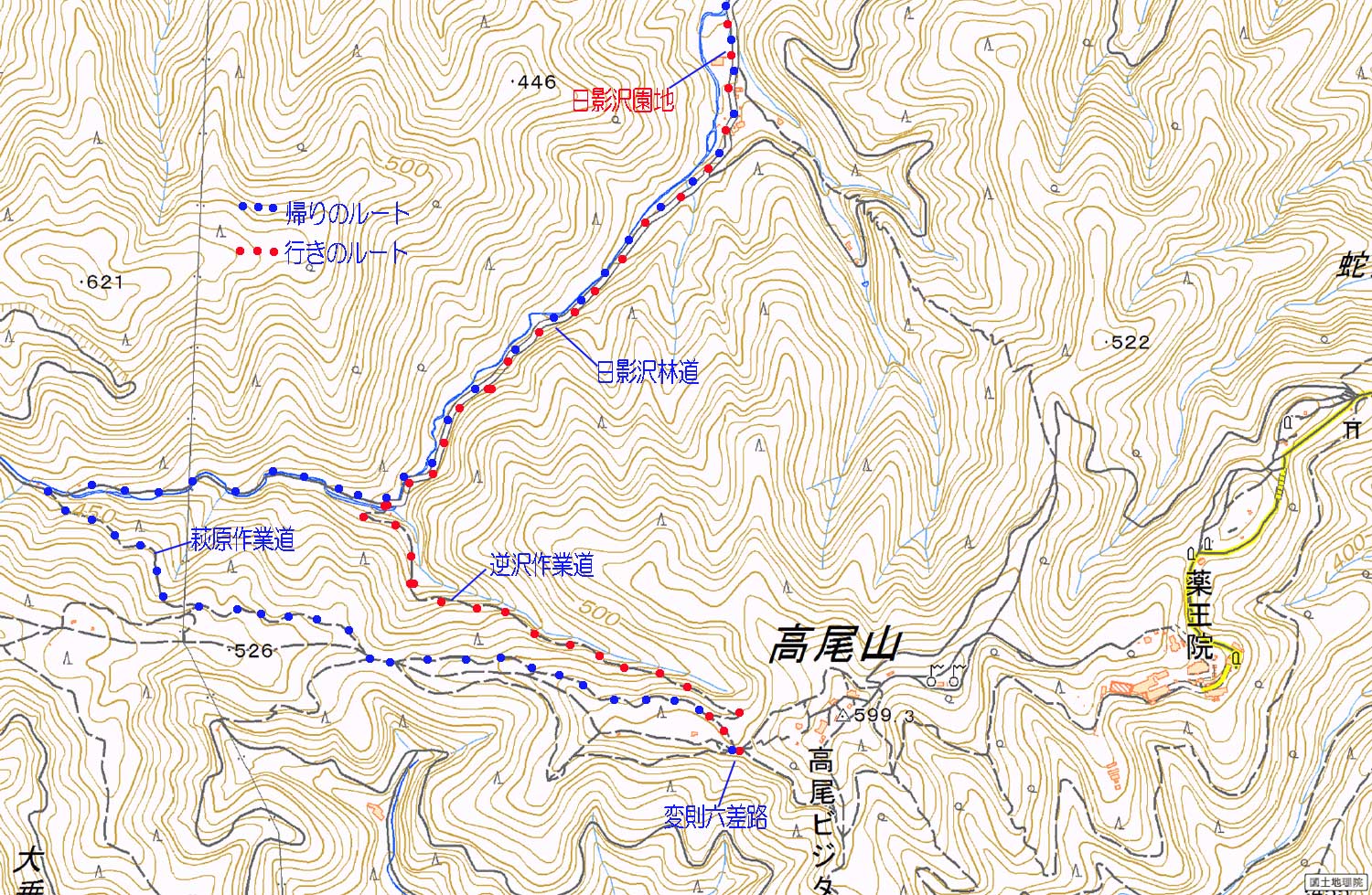 地形図を見ると日影沢林道の先で点線の山道が高尾から城山に至る尾根に上がっている。早速インターネットで調べたところ、逆沢作業道と萩原作業道であることが分かった。