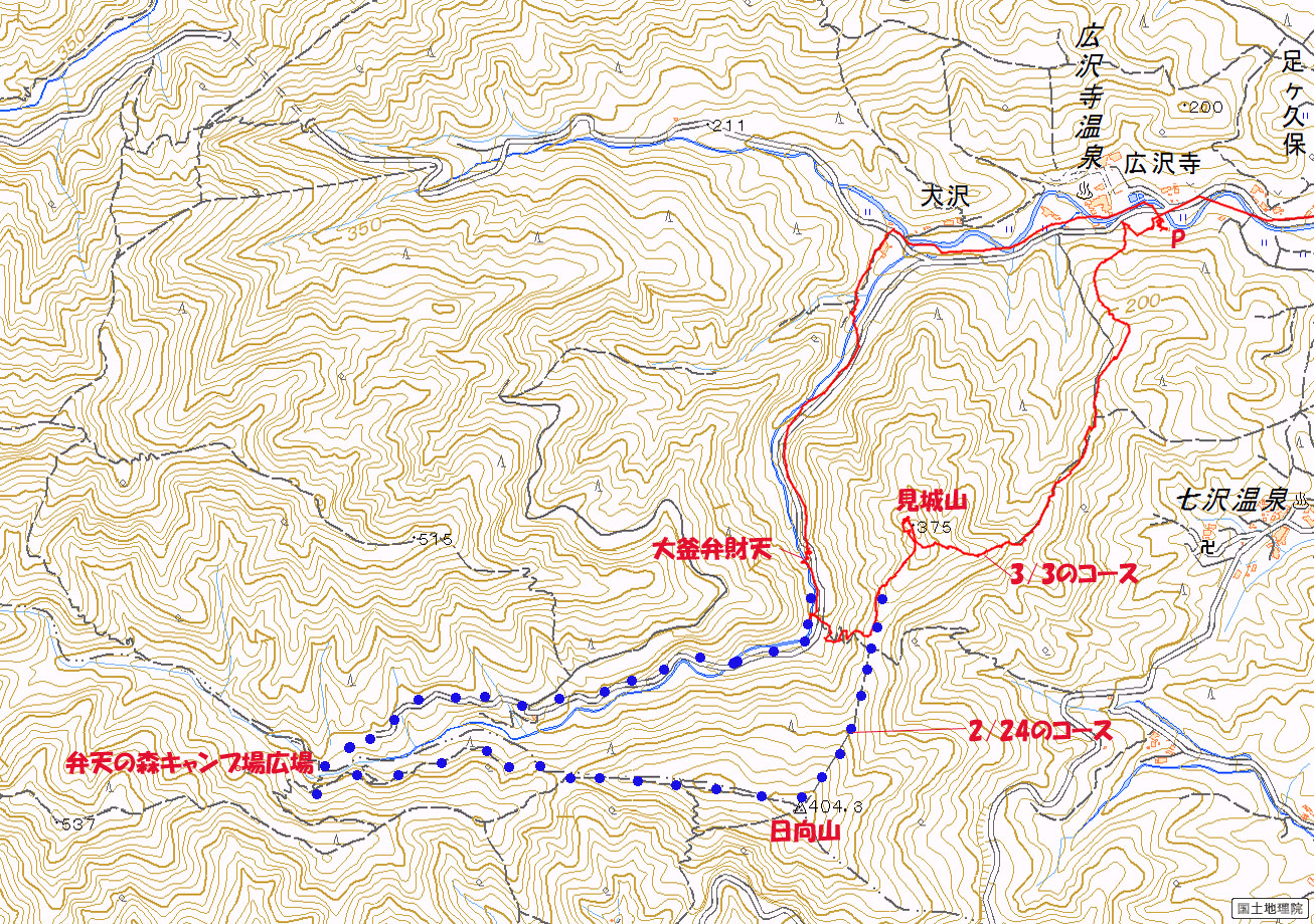 弁天の森キヤンプ場〜日向山〜見城山(みじよう山)(2016-02-24、03-03歩く)
