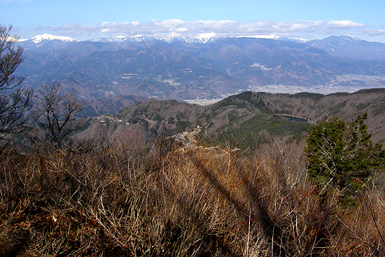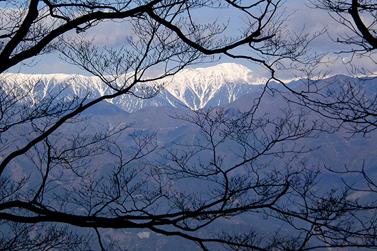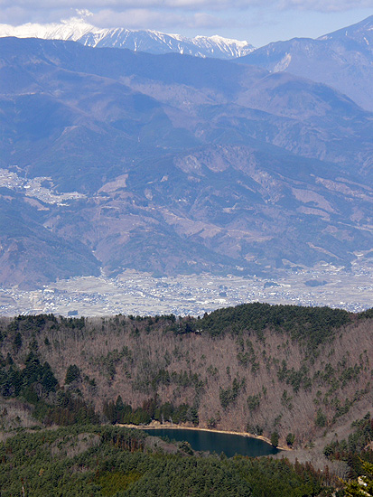 | 四尾連湖から蛾ケ岳 ('07-03-09歩く) 3月の関東近郊の山は新緑・花には早い、かといって雪景色が美しいわけでないので、 行くところが見つからないというのが正直なところである。いろいろ検討しているうちに、湖から登る蛾ケ岳を見つけ、山がダメでも 湖で写真を写せるかもしれないと行って見ることにした。 四尾連湖までどう行くか。中央高速双葉JCTから中部横断自動車道が 増穂ICまで開通しているので、 増穂ICまで行くと時間的には一番早い。しかし、大分遠周りしているので、中央高速甲府南ICで降りることにした。 ICを降りて、140号線にでて「市川大門」を目印に道なりに行く。途中から標識に従って市川大門へ左斜めに入る。 しばらく道なりに行くと「四尾連湖」の標識がでてきて左折し、さらに行くと「四尾連湖」右折の標識がでてきて、踏み切りを渡る。 後は一本道である。 初めての山は登山口までのアプローチがどんな風景が展開するか楽しみである。この四尾連湖までの 道はどんどんと高度を上げ、南アルプスの白銀の峰々が前衛の山の上に頭を覗かせてくる。それに斜面にへばりつくような小さな集落、 行ったことはないが、まるでネパールのようである。道は裏側に廻りこむとやがて四尾連湖に到着する。 水明荘の駐車場に止める。一日400円とあるが管理人がいないので戻ったら支払うことで出発する。 最初、尾根に向ってコナラの自然林の道を30分弱ほど登ると、大畠山分岐に到着する。右折してカラマツの混じる尾根をゆく。 右手を見ると南アルプスの白銀の峰が樹間より時々見えるが、木が茂りすぎて、すっきりしない。いつかは開かれたところにでて すっきりと見渡せるだろうと期待しながら行く。しばらく行くと、左前面にピークが見えてくる。登るのかと思ったら右を巻いてゆく。 ほとんど平坦な尾根をカサコソとコナラの落ち葉を踏みしめながら行く。少し痩せた尾根を渡ったりするが、アップダウンの少ない 極めて快適な自然林の尾根歩きがつづく。南アルプスの見え方は幾分改善されるが、すっきりとはいかない。だが、雲に隠れず見えていることは 分かる。何とか山頂まではもってくれと、願いながら歩く。丸太の橋を渡り、桧林にかかると、いよいよ登りとなる。自然林の明るく広い斜面 を稲妻型に登り、トラバースすると鞍部の六地蔵というところに着く。そこには六つのお地蔵さんの並んだ石仏があった。 ここから山頂までが本コースの最大の急登である。コナラの並木道のような尾根道を一直線に直登する。山頂まで10分とあるが、年寄り には堪える。一息つくのに立ち止まって右を見ると意外や意外、富士山が樹間から見える。また、左後ろを見ると南アルプスの白銀の山並みが競りあがってきている。 まだ、雲に覆われていないようで一安心し、山頂での絶景を励みに一歩づつ登って行く。 山頂はすばらしい絶景である。 南アルプスの農鳥岳、間ノ岳、北岳、前衛の山の櫛形山、甘利山、右に浮かぶように見える八ケ岳。さらに眼下にブルーの四尾連湖が・・・。 後ろを振り返ると大きな富士山が見える。いつも富士山を見ているがここから見る富士山はいやに格好がいい。 疲れも忘れて、雲のかからぬ間にと夢中に写真を写す。 大抵の山の山頂では15分くらいしか休憩は取らないが、ここでは30分もとってしまった。 それだけ景色がすばらしかった。後ろ髪を引かれる思いで下山する。下山は早い、1時間15分程度で下ってしまった。下山後は駐車料金 払うために湖畔の水明荘に行く。水明荘の前の湖畔のベンチで写真を撮ったり昼食を取りながらのんびりと約30分ほど休憩する。 帰りは、まだ時間が早いので、車窓からの山里の風景でも楽しみながら帰ることにして、林道のような道を久那土にでて、それから300号線で本栖湖に上って行くことにする。 久那土に至る山村はまださみしい冬枯れのたたずまいをみせているが、春の山桜が咲く頃はいいだろうなあ、と思いながら行く。一方、本栖湖へくねくねと上って行く車道の両側の斜面は ダンコウバイが多く、もう黄色く輝き早春の香りを漂わせていた。 (地図・ガイド) ・山と渓谷社 「山梨県の山」 ・1/25000地形図 市川大門 (コースタイム) 自宅4:55==相模湖IC6:12==甲府南IC6:55==四尾連湖(P)7:35〜45--大畠山分岐8:10--六地蔵8:59--蛾ケ岳9:16〜9:45--六地蔵9:56 --大畠山分岐10:41--四尾連湖(P)10:59 (特記事項) 蛾ケ岳と書いて「ひるがだけ」と読むが、最初、武田信玄の館から見て昼になると太陽がこの山の真上に来ることから 昼ケ岳と呼んだとのことである。水明荘の管理人に聞いたところ、蛭はいないとのこと。 |