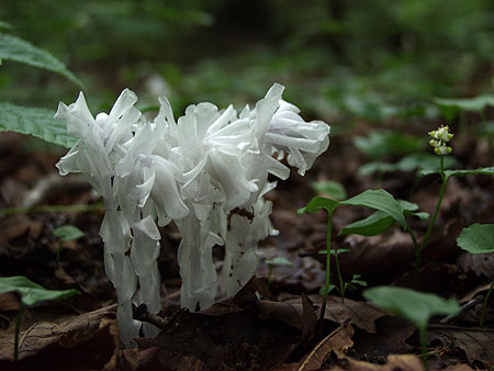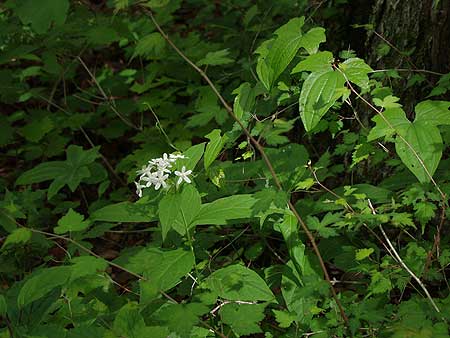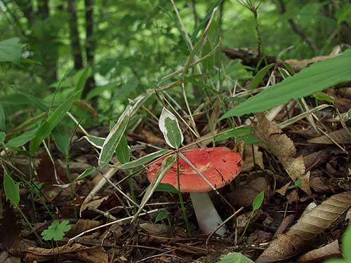 | 林道からいよいよ山道に入る。ここははじめての道である。緩やかに登っている。予想に反して コナラ、ミズナラの自然林が美しい。林床には上の左の写真のような白い花が群生している。 帰ってきてから野の花が好き 山の花が好きさんに聞いてクサタチバナ と判明したが、清楚でいい花であった。道は急登になったり緩くなったりを繰り返して美林を登って行く。 緑一色の中に紅色がひときわ鮮やかなベニタケが迎えてくれたりし、思わずほころぶ。 |