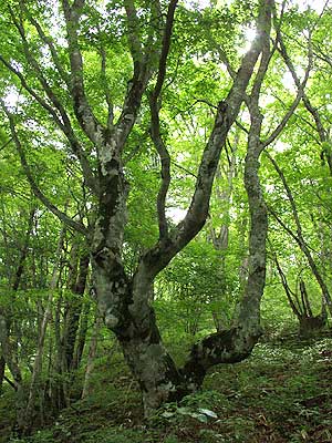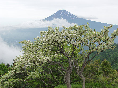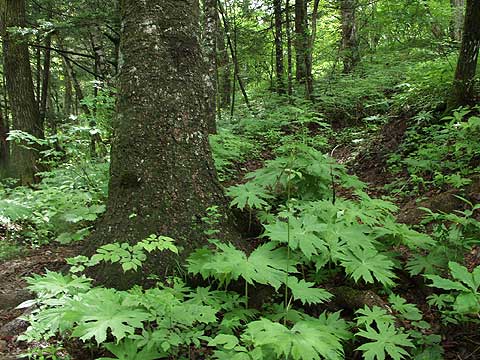 | 山道に入ってから30分も登ると道は小ピークを右に見ながら巻いて行く。 そしてブナやモミの大木の美しい樹林帯となり、林床にはヤグルマソウが群生している。雰囲気の良い 樹林帯を10分ほど登るとやや開けてきて、赤土の滑りやすい急登となる。日差しをさえぎるものがなく 暑く、我慢しながらあえぎあえぎ登る。やがて、山道の両側は立ち入り禁止のロープの張られた草地となり、 傾斜も緩み、右の草原の向こうに山頂が雲で覆われた富士山が見えてくる。 |