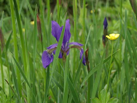 が先に進むことにする。 直ぐ見覚えのあるベンチのある展望台に着いた。そこには登山口から真っ直ぐ登ってきたご夫婦が休んでいた。 ベンチのそばには待望の花、アヤメが咲いていた。また、富士山も雲に見え隠れするがいつもの絶景が 広がっている。富士山の方は梅雨だけに期待してこなかった分、大感激であった。写真を写しながら休憩する。 |
