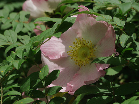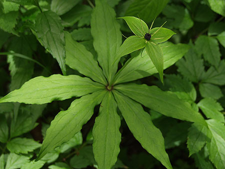 この後、御巣鷹山の下のお花畑まで足を伸ばし、戻り、いつもの広い林道を登山口へと下った。 開運山と御巣鷹山の間の樹林帯はすばらしく、林床のヤグルマソウの葉っぱとユキササの花が 木漏れ日に輝き美しかった。帰りの林道ではギンリョウソウに、また駐車場付近で山椒バラの花とも出会った。 さらに、さらに、どことは書けないが珍しいアツモリソウとも出会った。お花畑の花は早かったが、貴重な 花アツモリソウとの出会いは長い私の山歩き人生の中で一つのエポックメイキングな出来事であった。 |