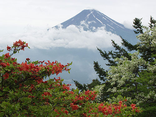 | ベンチの傍のアヤメ以外に花も咲いていないし、せめて三つ峠山頂(開運山)から富士山を眺めてみようと 腰をあげる。山荘四季楽園のそばには思いがけずサラサドウタンツツジが鈴なりに咲いている。 富士山も雲が切れてクッキリと見えるようになってきた。 |