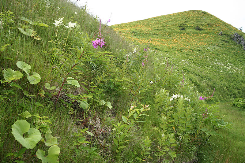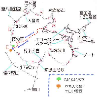 ![]() 姫木平・殿城山(1998-8-1歩く) ニッコウキスゲの咲く車山湿原の向うの尾根にどういう風景があるのだろうか。 車山に登ったとき妙に気になった。そこは調べてみると姫木平の殿城山であった。 一通り霧が峰も廻ったので、殿城山に登ることにした。 白樺湖を越えて姫木平 へくねくねと下る。カーブも終わり平坦な道をしばらく走ると、姫木平の別荘、ペ ンション地の入口となり、左折して道なりにどんどん登って行く。 途中、洒落たペンションがところどころに見える。また、ベランダや庭に色とりど りの花が溢れるばかりに咲いている。それを上りながら見るだけでも楽しい。 やがて、エコーバレースキー場が現われるが、右手に見送って更に登って行く と、先ほどのスキー場のリフトの中継点の広場に達する。 そこには広々とした駐車スペースやレストハウス、リフト乗り場があるが、今は季節 外れで閑散として寂しい光景である。 身支度をして、歩き始めると犬を連れて散歩しているおばさんと出会った。道を 聞いたところ、「熊がでたことあるので気を付けて」と云われ、家内はビックリする。 えらいところに来たなあ、という顔つきである。少し行って、軽トラ ックで登ってきたスキー場を保守する人に、念のため道と熊のことを聞いてみたところ、 今は熊は出ないから心配ないよ、と言われ家内も安心する。 道端にアザミ、朱色のフシグロセンノウ、トラノオなどの咲くカラマツで囲まれ た林道を登って行くと、左手が開けヤナギランの咲いているところにでた。 その先、少し行くと林道の終点となり、広場には白樺が青空に輝いていた。また、 そこには車山、殿城山方面への道標が立っていた。 左のカラマツ林の道に入って、いよいよ山道となる。道の草が刈り払われた手入れ の行き届いたカラマツ、ズミの樹林帯の中の道を行く。 樹林を抜けると、草原となりアザミ、コウリンカ、ヤナギラン、等が咲くお花畑 が広がっている。草原にはレンゲツツジの株も多く、6月中旬頃には見事な光景に なるだろうと想像させてくれる。 やかで、草原の登りとなる。振りかえると、蓼科山 が競り上がってきて大きく見える。また、これから登る殿城山も見えてくる。 しばらく登り、火口の様に左側斜面が切れてくると、今まで見られなかった マツムシソウが現われ、左手前方にはこれから歩く外輪山のような稜線が 見え、更にその向うに車山も見える。 コウリンカ、マツムシソウ、カワラナデシコ、ワレモコ、アザミ、等を愛でながら 登ると、やがて男女倉ピークの稜線に達した。左斜面の草原にはマツムシソウ、 カワラナデシコが咲き乱れている。ここからは快適な稜線歩きである。 すこし行くと 右側からスキー場のリフトが上がってきていて、廃虚となったレストハウスがある。 地図を調べるとブランシュたかやまスキー場とある。ここが大笹峰である。 この周りも花が多い、今までの花の他にギボシ、クルマユリなども咲いている。 左手は遮るものがなく快適な稜線歩きを進めてゆくと、やがて道標が立つ八島湿 原への分岐に達する。そこから、5分も登ると北の耳のピークとなり、遥か右手遠く に広々とした八島湿原と赤い屋根のレストハウスが眺望される。 北の耳の左側は切れ落ちており、風通しが良く涼しい。そのためか、切れ落ちた 急斜面にはニッコウキスゲの残り花がチラホラと咲いている。このピークを下ると お花畑でヤナギラン、名の分らない黄色の花が咲いている。 前方を見るとこれから行く方向にピークが見え、それに向って細い道が伸びて いっている。そのピークは南の耳である。登りの斜面にはマルタケブキの黄色い花と ヤナギランが群生している。結構きつい斜面であるが、写真を写しながら登っている うちにピークに達した。 そこからはなだらかな草原の道を行く。草原の彼方まで 広がっているマツムシソウと小さいススキの原が時々草原を渡る風でなびいている。 しばらく行くと右手に蝶々深山が見えてくる。多くの人が車山湿原の方から行列 を作って頂上へ、更に八島湿原の方へと歩いて行くのが小さく見える。こちらは閑散と して貸切のようである。 殿城山分岐に着くと、さすがに車山からくる人もいて、休んでいる人も多い。 分岐より殿城山寄りに行ったところで昼食とする。付近はシモツケソウが多く、また、 クロマメノキも少しあり、実をつんで食後のフルーツとする。 一休みした後、殿城山へとレンゲツツジの多い斜面を下っていく。そのうちダケ カンバの多い道となり、少し開けたところに「約束の丘」の標識がある。その付近 には太いダケカンバの木が繁っており、樹間より蓼科山が見える。 樹林帯を抜けると殿城山との鞍部となり、そこから殿城山に広々とした 開放的な草原を緩やかに登って行く。左後方を見ると今歩いて来た稜線が遥か遠くか ら続いて来ているのが見渡せられ、随分歩いて来たものだと思う。また、正面の草原 の上