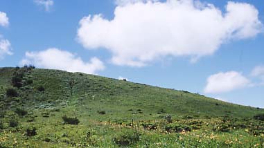 が見えて来た。左側の鷲ヶ峰への斜面はキスゲが盛りな頃は真黄色である。
