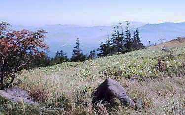 登りきるとマツムシソウやリンドウの花が咲き、岩が点在する庭園風のさわやかな草原となる。いつもこの草原で一休みする。