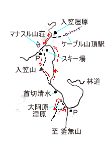 入笠山(1999-7-17歩く) 梅雨の合間をぬって手軽な山、入笠山に登ることにした。車で行く場合、できるだけ周回にしたいが 、どういうコースで歩くか難しいところである。マナスル山荘の前の駐車場に車を置いて、入笠湿原を廻り、 それから入笠山へ首切清水付近を経て周回し、その後、車で大阿原湿原入口まで行き、湿原を一周する コースとした。 樹間の林道を車で登って行くと、大阿原湿原入口くらいから明るくカラマツの茂る道となる。規則正しく 天を指すように林立しているカラマツの美しい風景や、カラマツの下の潅木 が刈り払われて、広々とした公園の森の中のようなところを通過する。やがてスキー場のあるマナスル 山荘に到着するが、山荘の前の道を隔てた駐車場には入梅時とあって一台も車は停まっていない。 林道を下りていって入笠湿原を一周することにする。木道の敷かれたこじんまりした湿原であるが、 白樺にアヤメが美しい。スズランの群生地もあって、初夏(6月中旬〜7月上旬)にはスズランと共にレ ンゲツツジの咲く美しい湿原であろうと想像させる。また、キヤンプ場にもなっており、夏休みはにぎわいそうである。 ここからマナスル山荘の方に戻って、スキー場の右脇を入笠山へ登って行く。左側のスキー場の斜面は お花畑である。フウロウ、アザミ、アヤメ、ギボウシ、ウツボグサなどの花が咲き乱れている。 右側は牧場で、針金の牧柵が山道沿いに登っている。牧場の草原は斜面を下り、反対側の山の広々とした 斜面を這い上り頂上まで続いている。そこには牛が放牧され、のんびりと草を食んでいる。 入笠山山頂まではカラマツ林の道で、結構きついところもある。上に上がるにしたがって草地が多くなり、まだ 早いが僅かにピンク色の蕾を覗かせたヤナギランも見られるようになる。30分も登るとザレ場状の頂上 となる。山頂は遮るものが無く360度の展望であるが、あいにく今日は雲が多く見晴らしは効かない。秋とか 冬の澄み切った青空のときはさぞかしすばらしい眺望だろうと想像される。 山頂の上の部分はガレ場状であるが、その廻りは草原となっていて、色とりどりの花が咲き乱れている。 フウロウ、ウツボグサ、コウリンカ、アザミ、アヤメなどが群生している。写真を写しながら、首切清水 の方に下る。少しお花畑を下ると笹の茂る比較的明るいカラマツ林の道となる。だんだんカラマツが 濃い道となり、しばらく行くと開けてきて林道に飛び出す。 ここを左に折れてマナスル山荘へと戻る。林道から見える小笹の原のカラマツの大木の木立が美しい。道端にはいろいろな花が咲いている。 特にオダマキ、アザミが多い。まだ、早いがヤナギランも結構多く、8月の花の頃は見事でないかと想像 させる。花を観察しながらのんびりと歩いて行くと、まもなく花の咲き乱れているスキー場につく。 入笠山に登る時、右手に見えた牧場のピークが気になり、偵察してみることにした。マナスル山荘の前 の道を少し行くと右手に上っている道があったので、登ってみたが、途中にゲートがあり、通行止めとなって いた。偵察は中止とし、車で大阿原湿原へと向かった。 車で5分くらいで湿原入口に着き、反時計廻り で湿原を周回することにした。しばらく行くが、湿原にはズミの古木はあるものの花は何も無い。白樺が 湿原の縁に点在し、湿原の美しさを保っている。周回して左側に移ると、湿原の奥にレンゲツ ツジの残り花が少し見られた。その付近で昼食とした。その後、沢を横断して周回の戻りコースに入った。 沢には思いがけずクリンソウの残り花が咲いていた。ここからは 大木の茂る樹林帯の道で、ツルアジサイが大木の遥か上まで絡みつき、白い花を咲かせ、 静かな森に華やかさを演出していた。まるで深山に迷い込んだようであった。 (コースタイム) 自宅4:45−マナスル山荘(P)7:50〜8:10−入笠湿原−スキー場9:00− 入笠山9:30〜45−林道10:25−マナスル山荘(P)10:45〜11:15− 大阿原湿原入口(P)11:20−湿原周回−大阿原湿原入口(P)12:30 (地図・ガイド) ・1/25000地形図 茅野、信濃富士見 ・山渓アルペンガイド北岳・甲斐駒・仙丈 ・略図 下記