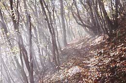 すぐ、平坦な樹林帯の道となり、樹間のところどころにカエデであろうか、真っ赤な紅葉が逆光