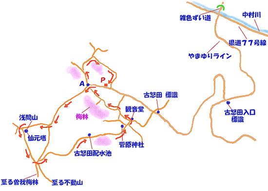 観音堂です。ここを左にどこまでも行きます。すると左手が開けてきて梅林が見え、A点に出ます。