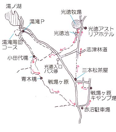 赤沼駐車場9:40−三本松茶屋10:10−光徳アストリアホテル入口