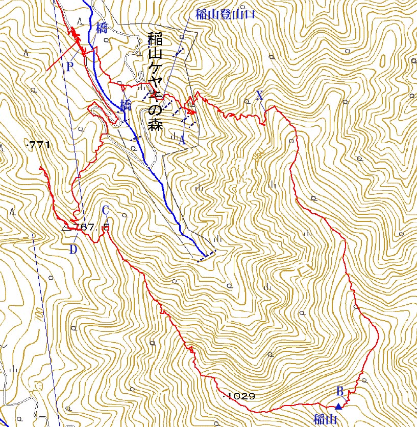 ・ Map (稲山へのルートログ、カシミール3Dにて作成)